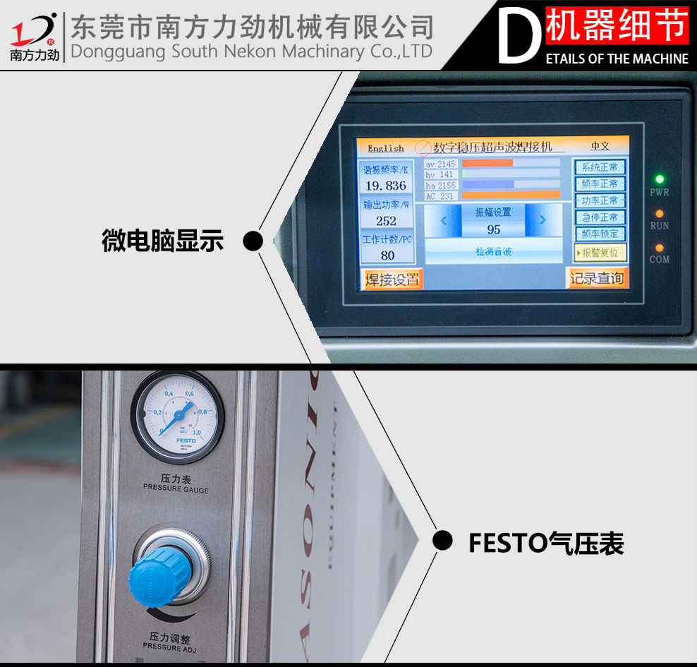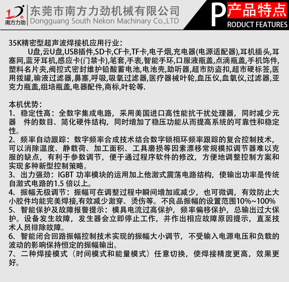 南方力勁機械有限公司是一家大型的超聲波設備研發(fā)、生產及銷售企業(yè),公司塑焊機事業(yè)部從事生產標準塑焊機,2600W-3200W塑焊機,4200W-5200W塑焊機等大功率焊接設備;15K、20K、28k、40K等精密型焊接設備,還有非標塑焊機設備,雙頭塑焊機四頭塑焊機、六頭塑焊機、中空板膠框焊接機護欄管焊接機、熱板機旋轉式熔接機、汽車門板焊接機汽車儀表盤焊接、汽車遮陽板焊接機汽車燈焊接機、汽車保險杠焊接機等,同時為客戶設計非標自動化塑膠焊接設備。