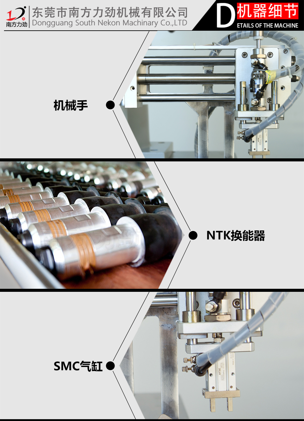 1.NTK換能器,SMC氣缸,功率強勁,穩(wěn)定性好。